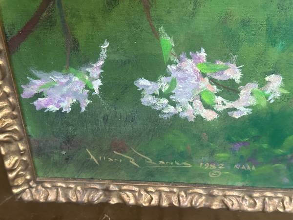 My mother purchased this lovely ALLAN R. BANKS at an auction at The Santa Barbara Historical Museum in Santa Barbara. I think it was purchased sometime in the late 1990's. The beautiful oil on canvas depicts a young girl dressed in red, sitting in a wicker chair in a floral landscape. The painting is signed and dated 1982 in the bottom left corner. The painting is approx 36" x 26", with framed size of approx 42"x33" This sale is for the painting only, the frame is an as is gift with purchase. Please e-mail with any questions