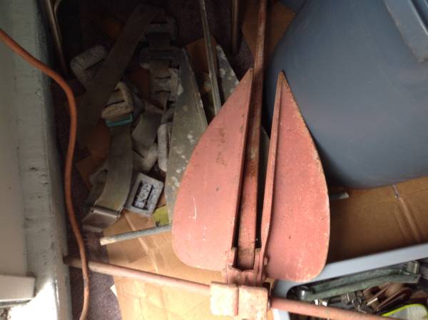 4 anchors, anchor lines, marine hardware, stove, 30 amp dock cord etc. LOW prices Lobster trap , misc commercial fishing items, funnel wire PVC ect.
